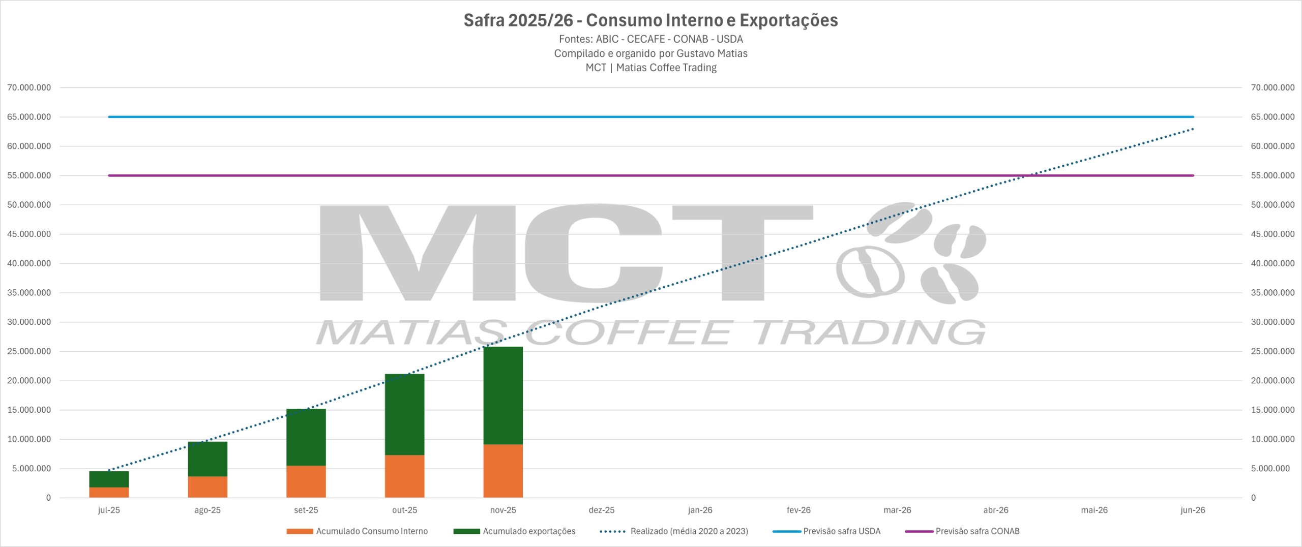 Considerando consumo interno e exportações já realizadas, o Brasil utilizou aproximadamente 25,8 milhões de sacas da safra 2025 (9,1 milhões no consumo interno e 16,7 milhões exportadas), o que representaria 46,9% do total segundo a CONAB (previsão mais baixa).