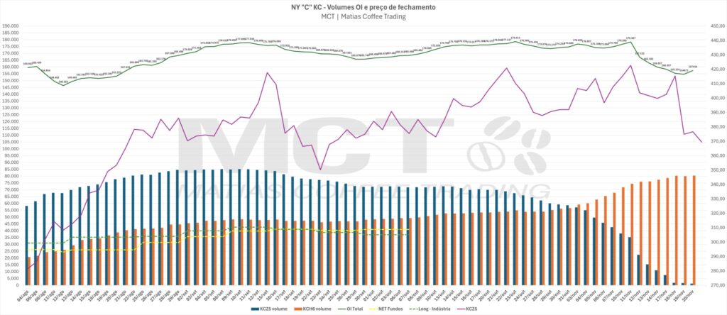 Foi uma corrida para buscar proteção à percepção do risco, a posição long (comprados) para a categoria indústria/negociantes aumentou de 30.939 para 42.598 contratos, +11.659 (aprox. 3,3 milhões de sacas) no mesmo período de um mês. Quando a indústria aumenta posições compradas, significa que está se protegendo do risco de alta, não que o café físico sumiu.