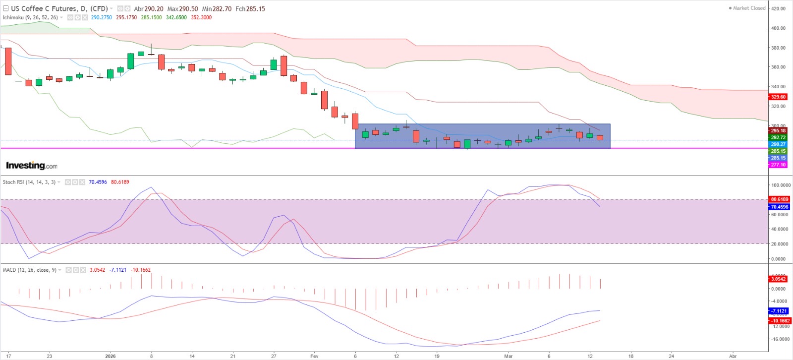 Há cinco semanas que o preço do Arábica oscila entre aproximadamente 277 e 305 c/lb, e nessa semana não foi diferente, abriu a 296,95 e fechou em 285,15 c/lb. O Robusta também está há mais de cinco semanas oscilando entre 3.520 e 3.820 USD/Ton, na sexta-feira fechou um pouco abaixo da faixa anterior, em 3.455 USD/Ton.