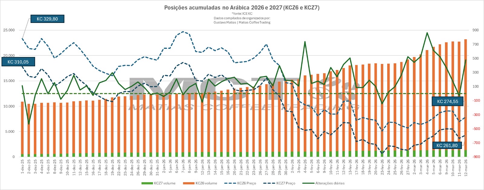 No gráfico abaixo você vai ver contratos futuros para 2026 e 2027, repare que o volume de negociações diárias (linha verde) aumenta quando o preço cai. Note também as barras laranja (2026) e verde (2027), são os volumes de contratos posicionados, subiram quando o preço da tela caiu (linha azul pontilhada).