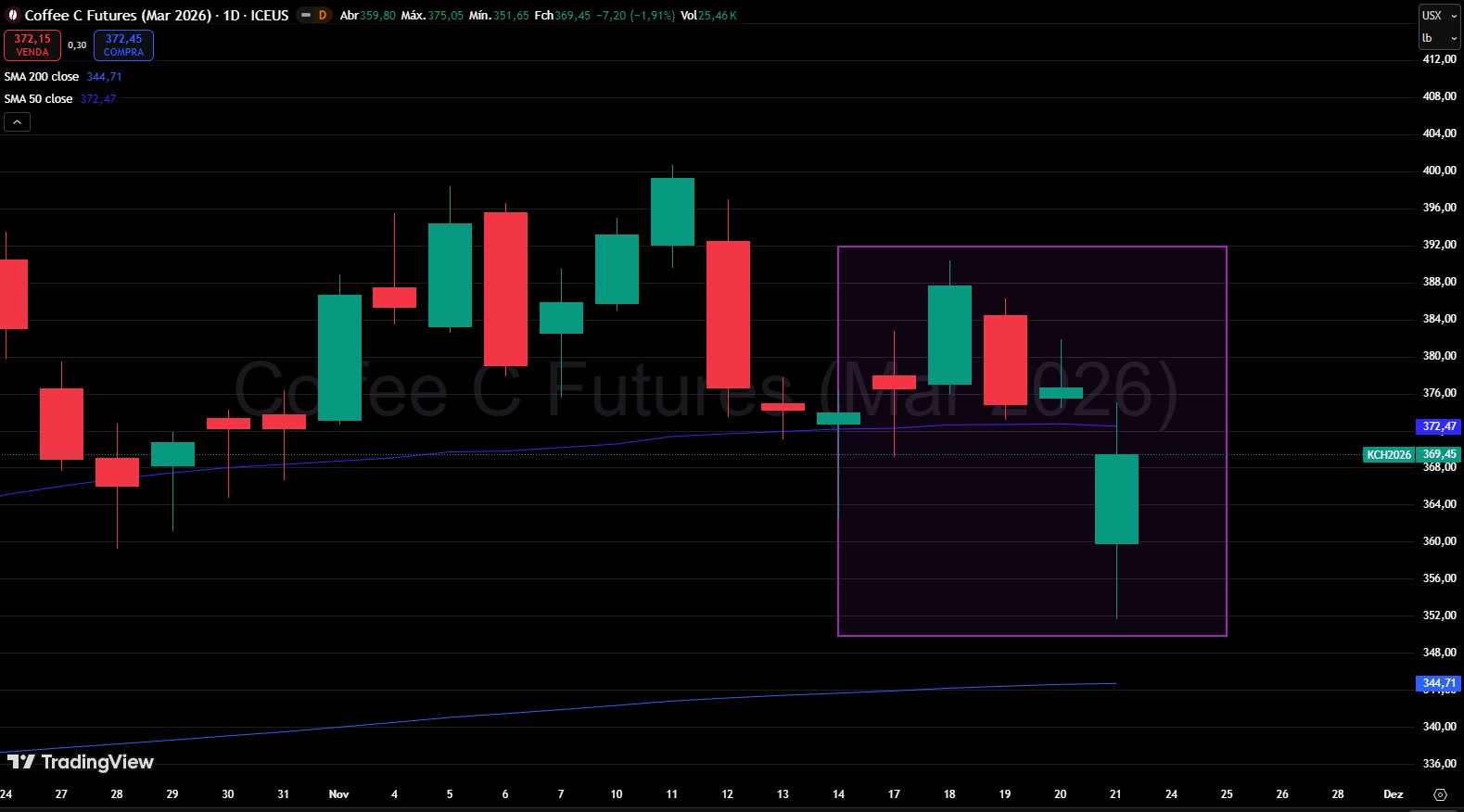 O mercado fechou sexta-feira em 366,50 centavos base Dezembro, contra sexta-feira retrasada em 396,85 centavos. Uma semana impressionante em NY […]